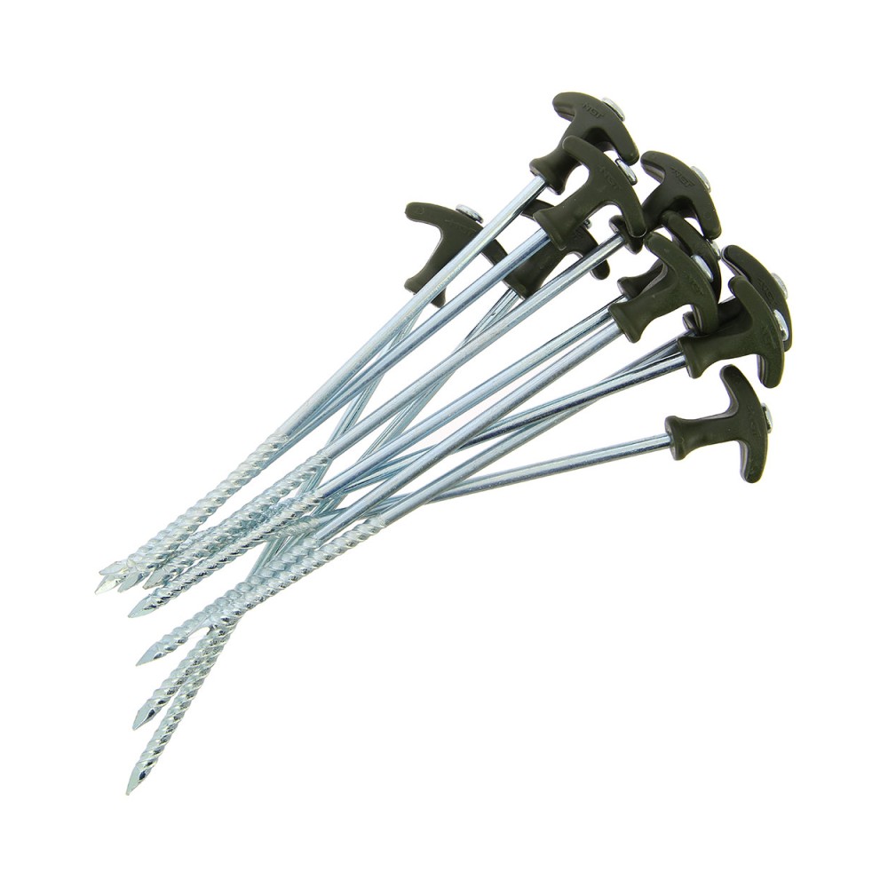 Universalių kuoliukų rinkinys (10vnt). Rinkinyje yra 30cm ilgio kamščiatraukio tipo kuoliukai. Jie lengvai įsisuka į žemę ir taip pat lengvai išsisuka, sukant juos prieš laikrodžio rodyklę. Kiekvienas kuoliukas turi didelę polimerinę rankeną, kuri užtikrina patogų kuoliukų naudojimą.